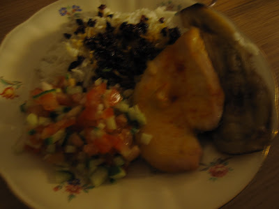 Ris med frästa syrliga bär (inte goji), saffranskycklig och aubergin i ugn, till det en superhackad gurk- och tomatsallad. Supergott!